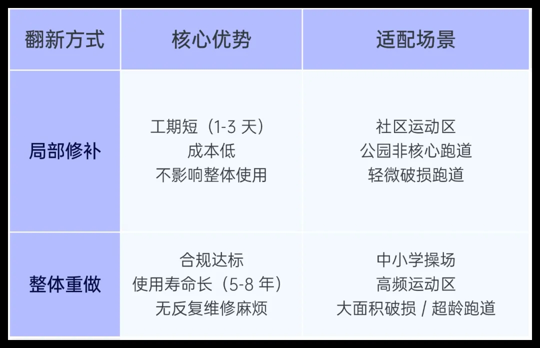 ✅看使用年限 / 需求:使用≤5 年、基础使用选修补;使用≥8 年、校园 / 高频运动区需合规达标选整体重做。